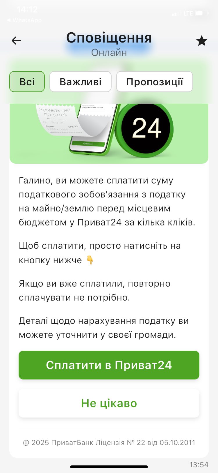 У додатку Приват 24 (поки що тільки для клієнтів ПриватБанку) надходять сповіщення про нарахування податків на землю (без врахування суми старого податкового боргу).