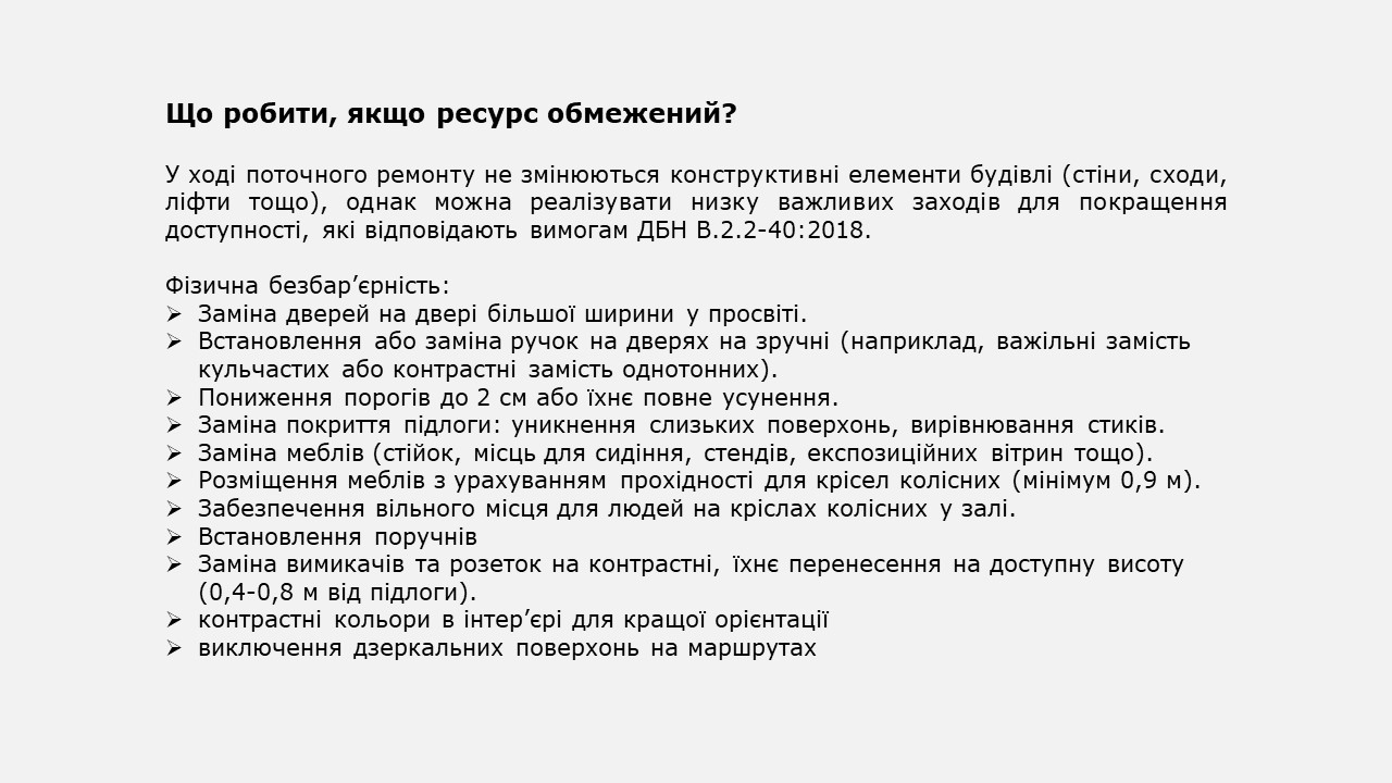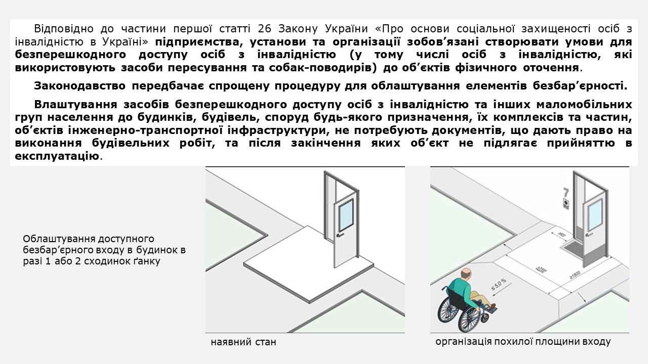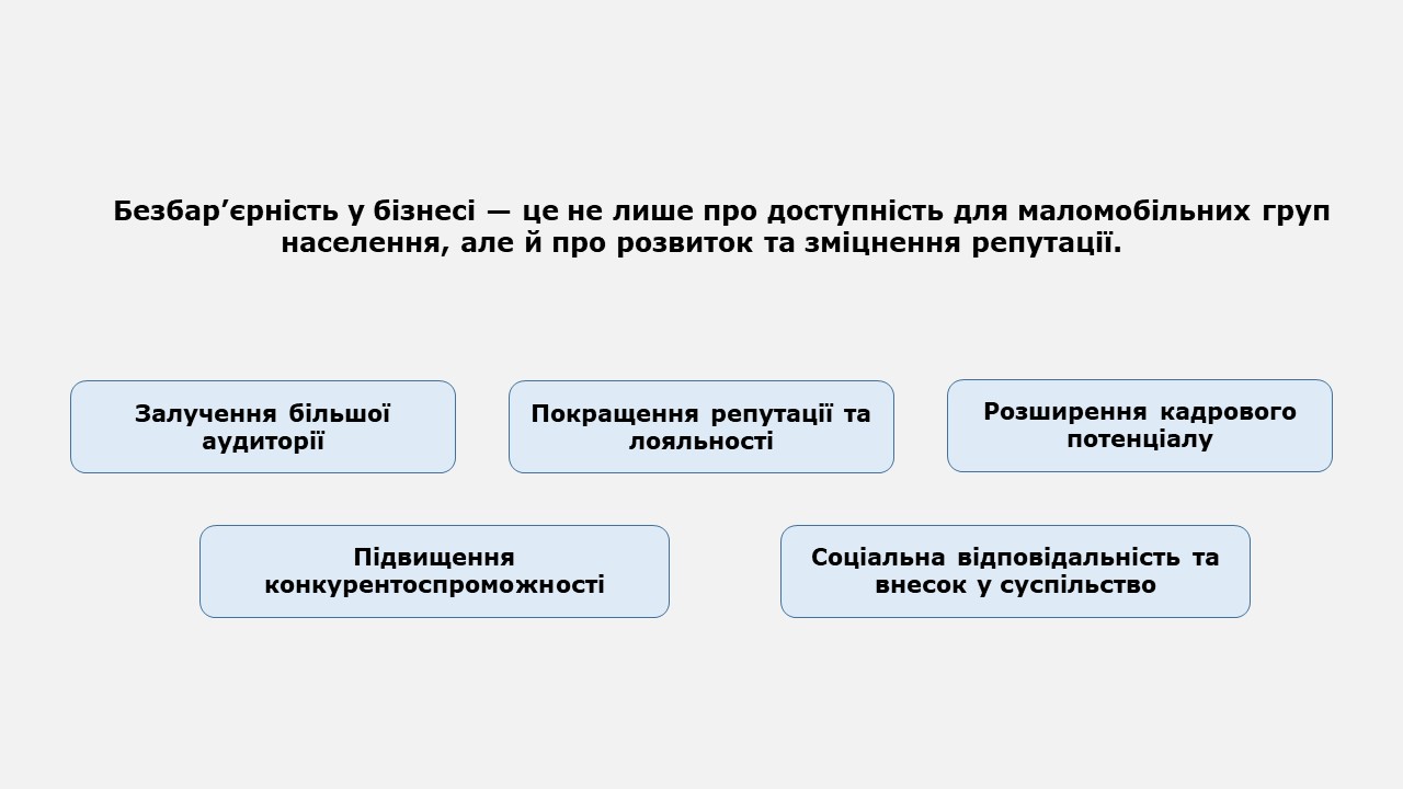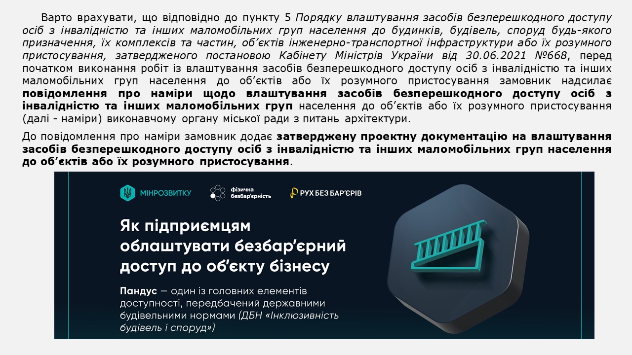 Під час засідання надали роз’яснення щодо спрощеної процедури для облаштування елементів безбар’єрності, обговорили та напрацювали механізми співпраці з метою облаштування безбар’єрного доступу до будівель і споруд на територіїгромади, управителями яких є представники бізнесу.